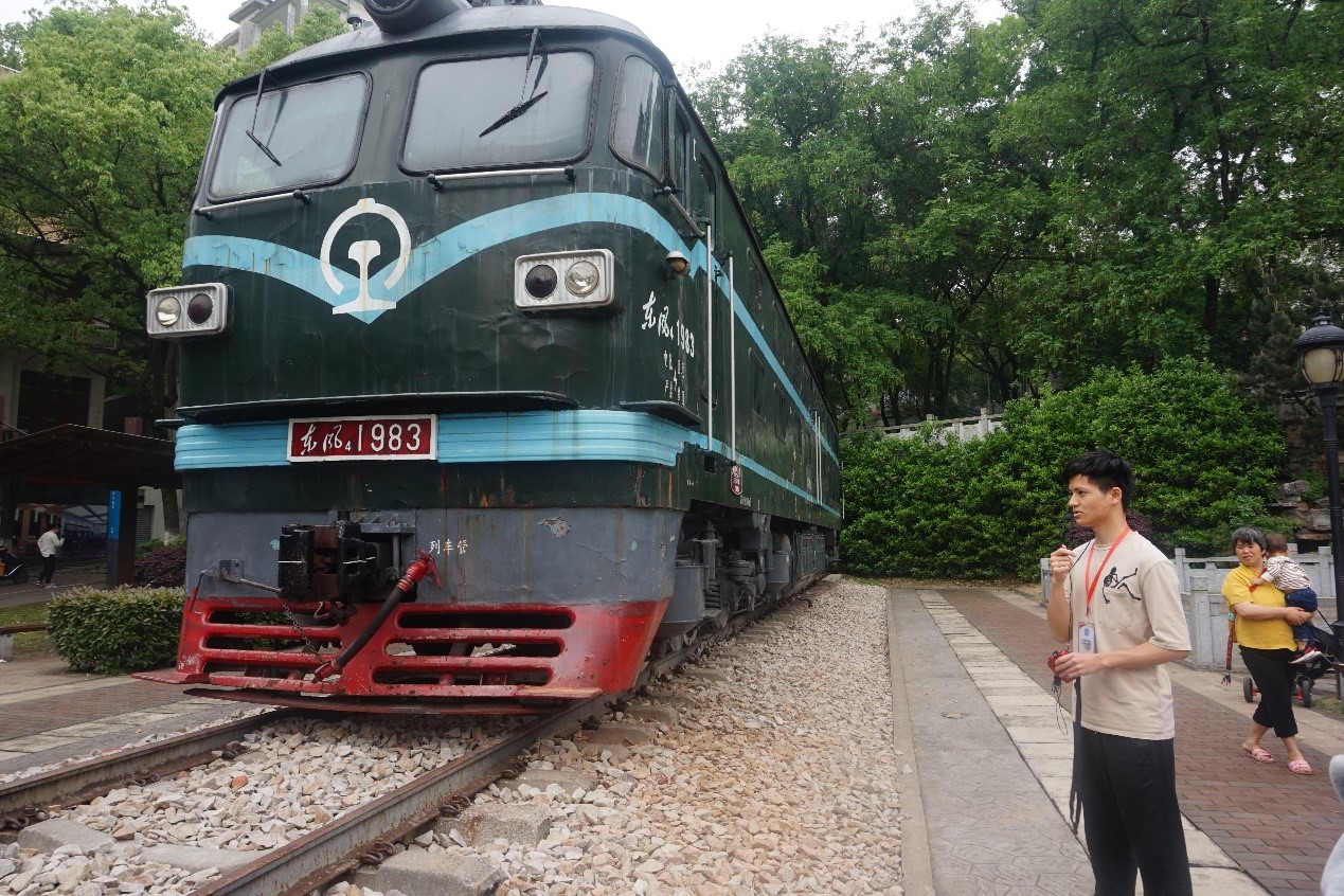 参观之初,全员站在铁路园正中央,由志愿者许倩同志带领全体学员回顾铁路园的由来以及建设过程。作为庆祝原长沙铁道学院建校六十周年的一份厚礼,铁路园园区呈露天式开放,有四条线路,三条线路上分别陈列三台机车,每一条线路,每一台机车都背负着中国轨道发展的重要使命。