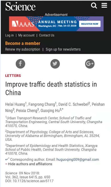 黄合来老师作为第一作者、湘雅公共卫生学院胡国清老师为通讯作者的论文“Improve traffic death statistics in China”被国际著名期刊《Science》以Letter形式发表(doi:10.1126/science.aav5117),该文是在作者团队针对全球195个国家和地区道路交通事故数据深度分析的前期研究成果基础上产生的。