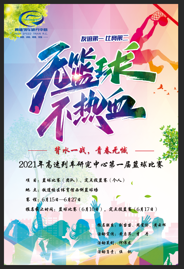 学习工作之余的生活,带动体育活动风气,增进实验室师生间的相处与交流,激发团队工作热情和拼搏创新的能力,特此举办一场面向高速列车研究中心全体师生员工的篮球比赛活动。