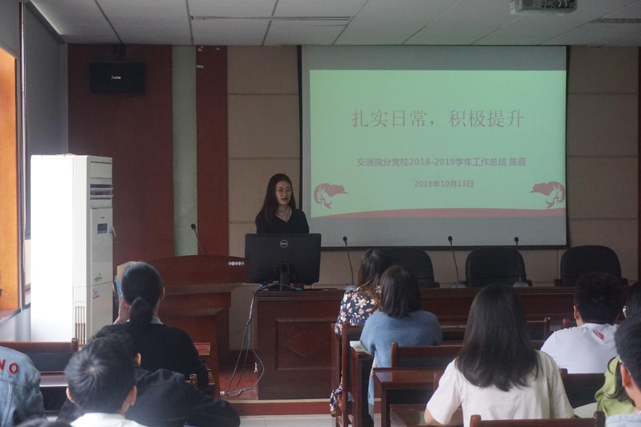 首先,上一届分党校管理部部长陈晨老师对分党校管理部2018-2019年度的工作进行了总结回顾,并对新一届分党校管理部提出了建议。陈晨老师以“扎实日常,积极提升”为主题,将分党校管理部的主要工作概括为“一个核心,两个重点,三个常规工作”。“一个核心”指的是发展党员,“两个重点”即党员的学习教育工作和会议召开工作,“三个常规工作”分别为宣传报道工作、党支部考核工作、档案清查及毕业生档案封档工作。2018年,在分党校管理部的工作配合下,交通院党建工作取得了非常优异的成绩。陈晨老师还为与会人员详细阐述了分党校管理部各个小组的工作职责,同时提出了三个分党校管理部仍需努力的方向:第一,提高工作积极性,尽量实现工作预报;第二,及时反馈问题,并提醒各个支部;第三,各个小组做好工作日志,做到一月一统计。