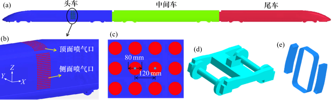 2)头车流线型与等截面车身过渡位置和等截面车身顶面分别以0.1U喷气时均降低了列车整车阻力,流线型头部过渡位置喷气时整车减阻2.22%,减阻率小于等截面车身顶面喷气。等截面车身喷气显著降低了中间车和尾车的壁面剪切应力,壁面剪切应力减小的幅值和范围均大于流线型头部过渡位置喷气。