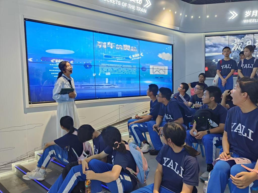 随后,学生们移步至气动实验室,在这里通过近距离观察气动动模型实验台和列车的动模型,大家对列车空气动力学原理有了更为深刻的理解。紧接着,大家又参观了碰撞实验室,近距离接触试验台,通过讲解员的介绍,充分了解了碰撞吸能装置的设计理念和技术细节。此外,学生们还与基地志愿者展开了交流,分享了他们的学习体会和实践经验,并一同探讨了未来轨道交通领域的发展前景。